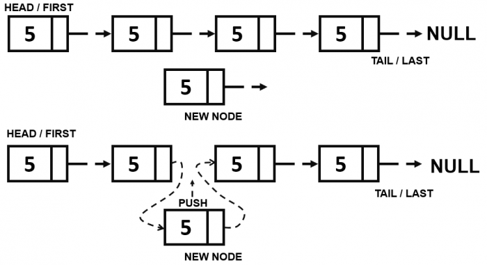 Untuk operasi push yang melibatkan head dan tail itu sangat sederhana. Karena pada head nodenya belum ditunjuk pointer apapun, sedangkan pada tail, pointernya menunjuk pada NULL. Oleh karenanya operasi push pada head dan tail sangat sederhana. Berbeda sekali dengan operasi push pada index-N. Operasi push yang dilakukan pada index-N melibatkan dua aksi, yang pertama adalah memutus pointer dari node index-(N-1) ke node index-(N+1); kemudian menghubungkan pointer dari node index-(N-1) ke node index-N; dan dilanjutkan dengan menghubungkan pointer dari node index-N ke node index-(N+1). Proses ini disebut juga dengan insertion atau proses menyisipkan data ke dalam list.